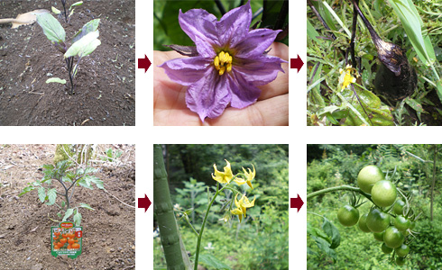 上段は茄子、下段はトマト。いずれも左から、若葉→花→実。