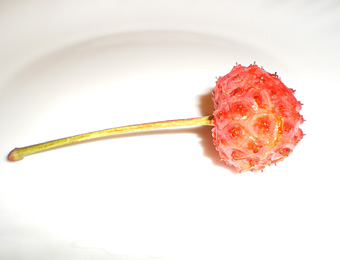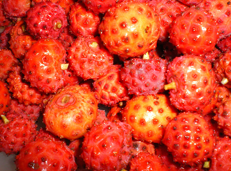 遠目には、ただ赤くて丸い実ですが、近づいてみると、このとおり。ゴツゴツした感じは、鉄兜のようでもあり、鬼の金棒のようでもあり、はたまた鉄瓶の肌のようでもあり...初めて見たときは、正直、あまりおいしそうな感じはしませんでした。