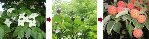 ハンカチのような白い花(写真左)。花びらに見えるのは、実は4枚の苞(ほう)。苞が散ると真ん中の部分が青い実(写真中)になり、秋には色づきます(写真右)。