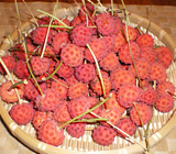 日に日に秋色が深まる森の中。樹上では、山栗やくるみ、どんぐりなどがせっせと実を結んでいます。そんな中、真っ先に鮮やかな赤い実をつけて楽しませてくれるのが、これ。6月29日付けのブログで、ハンカチのような白い花をご紹介したヤマボウシの実です(上の写真は果実酒を仕込むために軸の部分を切り落としたもの)。