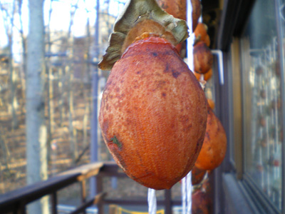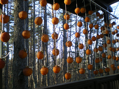 11月9日付けのブログでご紹介した干し柿が、順調に熟しています。と書きたいところですが・・・今年は干し柿戦線に異常あり。妙に暖かい日が続いて、晩秋らしい気候がなかったせいでしょうか。なかなか、柿の水分が抜けてくれません。最初に吊るした柿は百匁柿 (ひゃくめがき) という大きな品種だけに、自らの重みに耐えかねて落下してしまうものが続出。干し柿作りを始めてかれこれ十年近くになりますが、こんなことは初めてです。