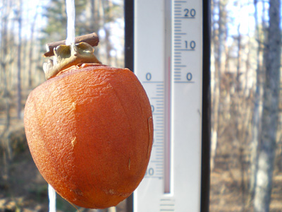 食べ頃まで、あとひと息のコロ柿。それにしても、この時季の気温が10度近いのは、やはり温暖化の影響でしょうか。
