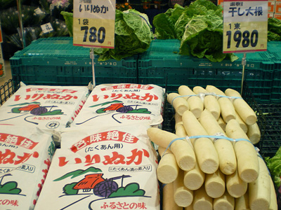 店頭に鎮座する干し大根と煎り糠の山。冬が来たな、と感じる風景です。