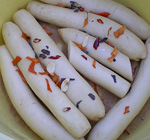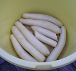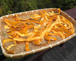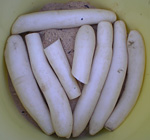東京で暮らしていたころに自分で育てた練馬大根をベランダで干して沢庵漬けしていた私としては、森へ移住してからも当然、「自分で」大根を干しました。森の中で白いカーテンのように連なる干し大根は、とても素敵な風景。と、ひとり悦に入っていたら・・・なんと、干した大根の芯が凍って鬆(す)が立っているではありませんか。
