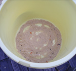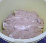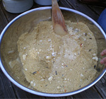 今回は、約8kgの干し大根を使いました。それに対して、米糠が800g、粗塩が400g、ざらめ糖が300g。昆布1/2本、赤唐辛子2本、干した柿の皮とニンニクスライス少々も加えました。柿の皮の代わりに、干したみかんの皮も使えます。