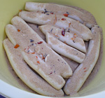沢庵漬けの材料は、大根と米糠(こめぬか)と粗塩(あらしお)が基本。わが家ではさらに、ざらめ糖(手前の鉢の中)と昆布、赤唐辛子、干したニンニクと柿の皮(白いお皿の上)を加えます。