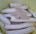 教わるまでは「沢庵漬けなんて、むずかしそう」と思っていたのですが、実際にやってみると拍子抜けするほど簡単。仕込む段階での糠はさらさらに乾いていて手が汚れることもありませんし、途中でかき回す必要もないので、糠漬けよりよほど楽ちんです。仕込むだけ仕込んだら、あとは目に見えないミクロの世界で行われている発酵の期間を「待つ」だけ。時間との共同作業と言えるかもしれません。