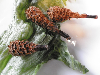 この海老フライ、冬の森で探せばいつでも見つかるかというと、そう簡単なものでもありません。ちゃんと海老フライ形になっているものは意外に少なくて、齧りかけて途中で放り出してしまったもののほうが圧倒的に多いのです。根気強いのと飽きっぽいのがいたり、器用なのと不器用なのがいたり、リスにも個性があるのでしょう。たまに形の整った美しい完成品を見つけると、腕のいい職人仕事を見たようで、なんだか嬉しくなってしまいます。逆に齧りかけ途中で放り出したものも、それはそれで愛敬があっていいものですが。