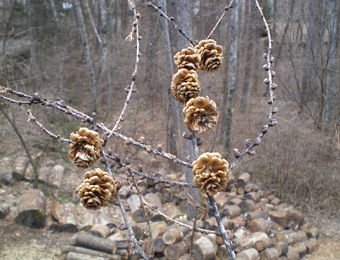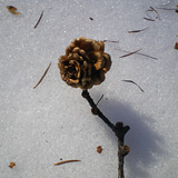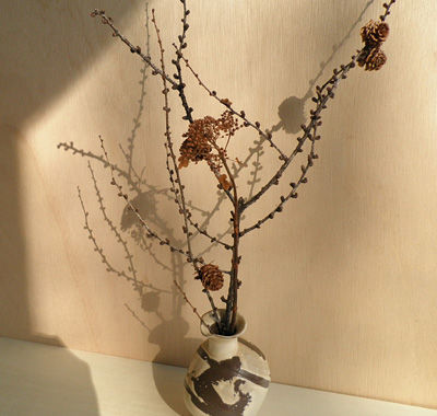 一方、緑のない時季、冬の森に咲くバラの花のような松ぼっくりもあります。こちらは、リスのお食事用ではなくて、わが家のお飾り。一輪挿しに活けて、花のない季節の室内で咲いてもらいます。
