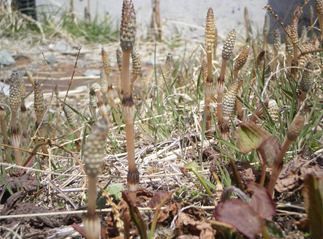 森に春の陽気が満ちてくると、土の中からいろいろな命が芽吹いてきます。まっ先に春を告げるのは前号のブログ(春の顔)でご紹介した蕗の薹ですが、日あたりの良いところでは、つくしの坊やも顔を出してきました。
