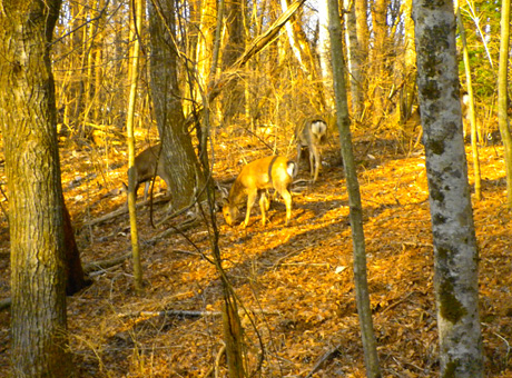 そして、下のほうばかりに気を取られて歩いていると、突然の気配に驚くことも。物音のする方に目をやると、鹿の群れが森の中を走り回っています。