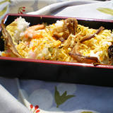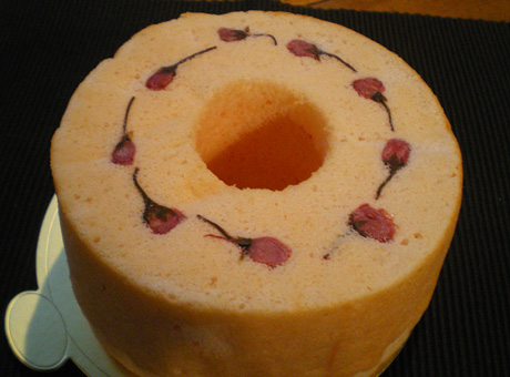 桜の花びらの塩漬けで飾ったシフォンケーキ。