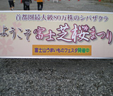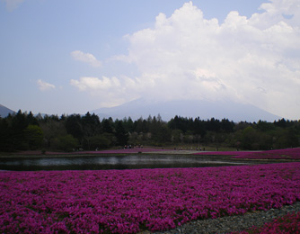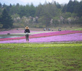 「桜のハシゴをしよう」と、次に訪れたのは本栖湖近くの「桜まつり」。桜は桜でも、こちらは芝桜です。80万株の芝桜の群生地という触れ込みですが、「本日四分咲き」の表示。花の文様は、本栖湖の龍神伝説にのっとって巨大な龍を形どっているそうですが、四分咲きのため、はっきりとはわかりませんでした。