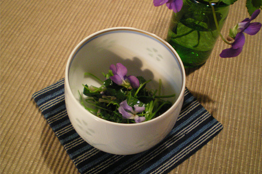 毎年のように作る、すみれのお浸し。さっとゆがいて、三杯酢で和えました。