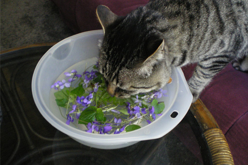 水を張ったボールにすみれを浮かべていたら、すっ飛んできた家猫。蜜蜂の嗅覚と同じ??