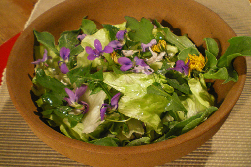 そしてこちらは、「すみれとたんぽぽのサラダ」です。味付けは胡麻油と塩だけというシンプルなサラダですが、すみれのおかげで、ちょっと華やかに仕上がりました。たんぽぽとレタスを手でちぎって胡麻油で和え、塩で味を調えて、すみれを散らすだけという簡単レシピ。地元の道の駅で買ったアイスプラントがあったので、それも加えてみました。