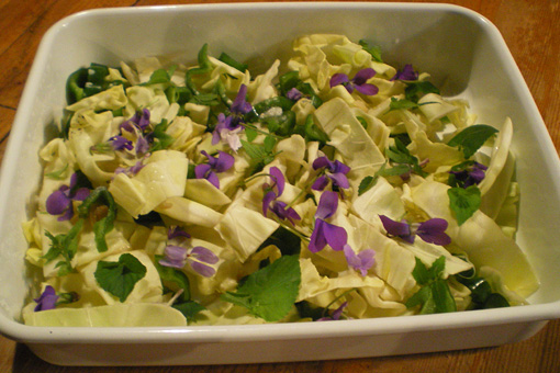 キャベツの塩麹漬けにも、すみれを散らしてみました。