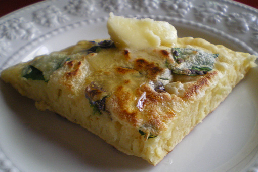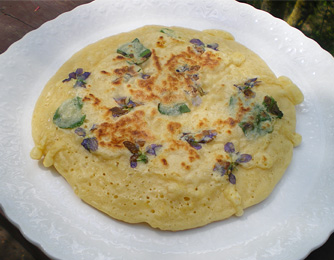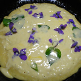おやつには、すみれ入りのホットケーキを焼いてみました。生地の表面にすみれを飾り、その上から薄めの生地をかけて焼くだけ。今回はベーキングパウダーの量を間違えて、失敗作 。