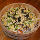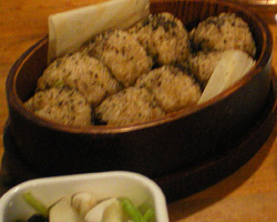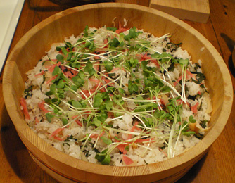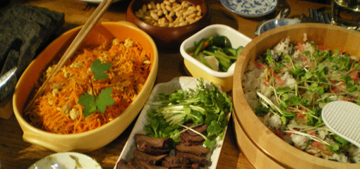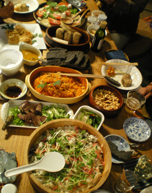 持ち寄られたものは、竹炭入りのパン、マーマレード、自家栽培のお米で作った玄米おむすび、糠漬け、鹿肉の塩漬け、人参シリシリ、油揚げの袋詰め、散らし寿司、フルーツケーキ、サラダ、ハーブの生葉、ワイン、ビール、日本酒などなど。珍しく、お酒以外はすべて手作りの品でテーブルが埋まりました。今回のメンバーは、たまたま農に関わる人やクリエーター、ミュージシャンなど、自分の手を動かすのが好きな人が多かったせいかもしれません。普段のポットラックパーティーではここまで手作りが揃うことはまずありませんし、それでかまわないのです。