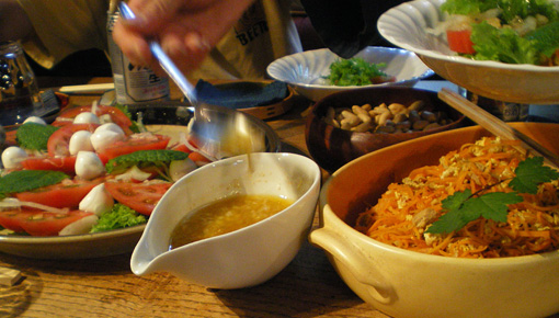 自分も座りこんでおしゃべりしていたいというわがままなホステスなので、基本は、ともかくセルフサービス。お料理の取り分けも、お茶を淹れるのも、お酒を割るのも、すべて「ご自由にどうぞ」の世界です。あまり気を遣わないほうが、みんなが楽しめるような気がするからです。