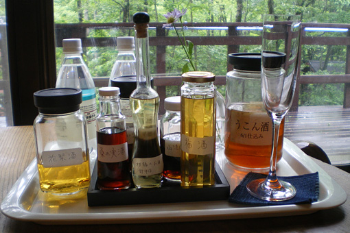 ふだんから仕込んでおいた果実酒が、こんなときに役に立ちます。今回並べたのは、梅、花梨(かりん)、うこん、ヤマボウシ、桑の実、柚子の果実酒。天然の炭酸水を添えて。