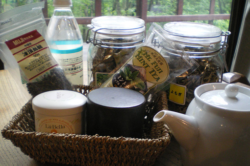 日本茶、紅茶、烏龍茶、ミントティー、手作りのヨモギ茶とドクダミ茶、オオバコ茶、そして天然の炭酸水。この他に、持ち寄りの一品で、自家栽培ミントの生葉もありました。