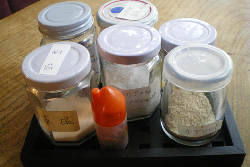 今回並べたお塩は、イタリアの岩塩、ヒマラヤの岩塩、沖縄の自然塩、藻塩(もしお)、そして手作りの柚子ソルト。これは、薪ストーブの上にのせてカラカラに干した柚子をミルで挽いてお塩と混ぜたものです。