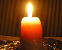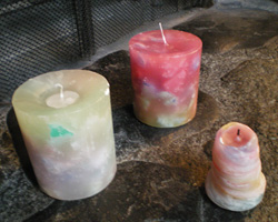 今回はなんと、キャンドルまで自前でした。参加者の中にキャンドル作家がいて、自作のキャンドルを持ってきてくれたのです。まずは明るいところに飾って眺め、宴もたけなわになった頃に灯しました。ゆらぐ炎は、それだけで癒し効果絶大。そもそもが万華鏡ワークショップの二次会ですから、持参した万華鏡を覗いてキャンドルの炎を眺める人も。この万華鏡は、チップを入れるタイプではなく、三面鏡の原理で目の前の景色が変化するというものなのです。