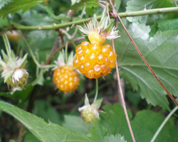 右:ジャムにする赤い野イチゴは、花が咲いたところ。