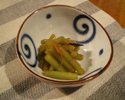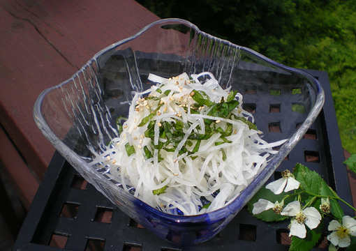 間引き大根の千六本に畑の紫蘇を加えて、さっぱりサラダに。