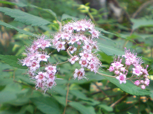 上:白雲木(はくうんぼく)? 下:下野(しもつけ)/小さくてわかりにくいのですが、どちらの写真にも食事中の蜜蜂の姿が見えます。