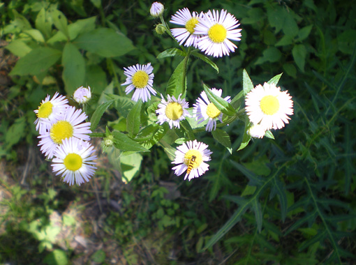 都会の道端などでたくましい姿を見せるヒメジョオンも、高原のそれはスリムで楚々とした美人。ここでも、蜜蜂が食事中。