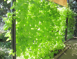 日当たりを好み、6月以降気温が上がってくるとぐんぐん伸びます。ネットに添わせて誘引してやれば、ライムグリーンのシェードができます。覆いたい部分が広い場合はプランターより地植えがいいと思います。