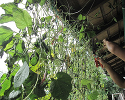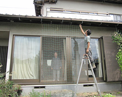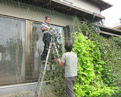 7m幅の緑のシェードの取り外しは、涼しい葉影を作ってくれたツタ達に感謝しながらの作業です。3人で2時間ほどで幕引きは終わりました。ネットは来年用に、取っておきます。