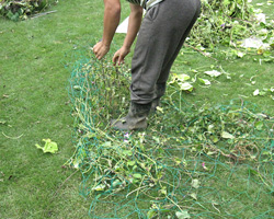 朝顔や宿根朝顔は茎自体がネットに絡みついていて、外しにくく、「ネットごと捨てちゃおう。」と言う声も上がりましたが、「そんなのエコじゃないよ。」とがんばってツルを取り除きます。