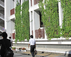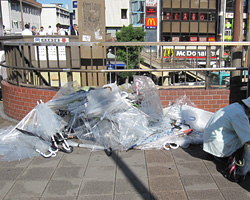 壊れたビニール傘の山が台風のすさまじさを物語っていますが、駅前の公民館のゴーヤは大丈夫だったようです。今しばらく通勤の人々の目を楽しませてくれることでしょう。