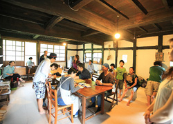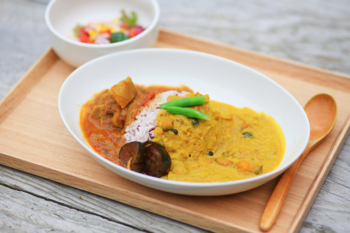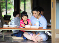 昼食は、里山の恵みである猪肉とかぼちゃの2種類のカレーと夏野菜のサラダでした。今回のランチを作ってくれたのは「レプラコーン」というチーム名で面白いコトを里山でやっている渡辺恵さんと福田由起さんです。築300年の古民家でアイリッシュの音楽会や影絵ミュージカルを開いたり、村の長老のみかんを販売したり、囲炉裏で飲み会を開いたり、今回のように料理のケータリングをしたりと、2人で里山に新しい風を吹かせています。「レプラコーン」とはアイルランドに伝わる小人の妖精のことですので、その名の通り2人の活動は風のように自由です。スパイシーに柔らかく煮こまれた猪肉の里山カレーはおかわり続出で、あっという間になくなってしまうほどの美味しさでした。