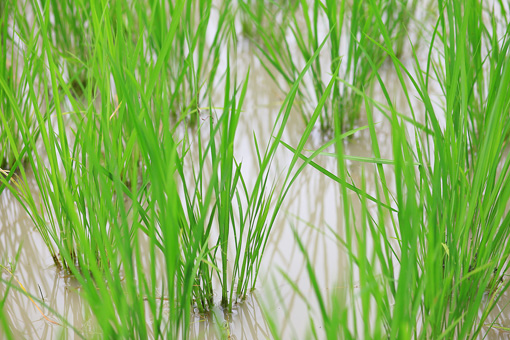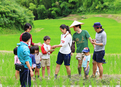 午前中の作業は、2回目の田の草とりです。田植えから約一ヶ月半が経った今の時期、稲は分けつが始まりだいぶ伸びてきました。すくっと伸びた稲の葉は、背筋を伸ばした青年のように水田に立ち上がり、すがすがしい姿です。