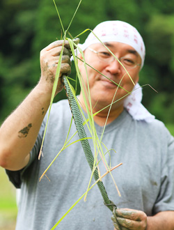 すがい縄とは稲刈りの時、刈り取った稲藁を束ねて縛るための縄のことです。約1反6枚の棚田では数百本のすがい縄が必要になります。