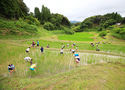 暑くもなく寒くもなくという過ごしやすい天候の中、6枚の棚田の田の草とりはみるみるうちに終了しました。やはり、手作業の農業は人海戦術ですね。40数名もの人が一緒に作業すれば、早いものです。僕一人ではきっと1週間かかったであろう作業が半日で終わりました。