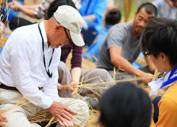 すがい縄を40数名へ一度に教えるのは難しいので、僕の師匠である長老2人に来て頂きました。「こんぴら」さんという屋号の柴崎栄一さんは86才、「かわばた」さんという屋号の柴崎五一さんは82才ですが、まだまだ現役バリバリのお百姓です。