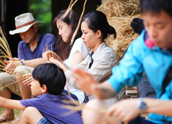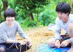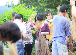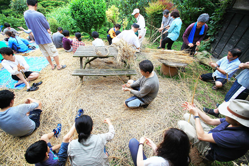 「ゆうぎつか」の庭でわらないを始めると、稲藁の何とも言えない香ばしい草の香りが天然のアロマとなり、心を落ち着かせてくれます。