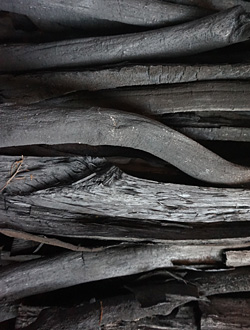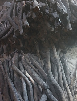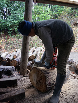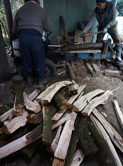 山で木を切ることは危険な作業だし、伐採した重たい木を運び、割り、焼き、温度管理等々、真っ黒になって一連の作業をすると一週間はかかります。