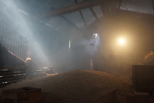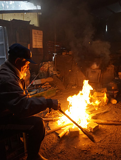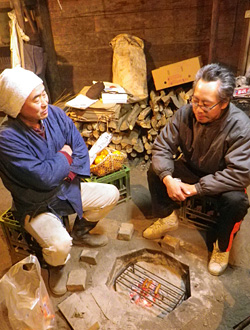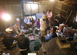 炭焼き小屋へ行くと、4人の長老たちが炭火に当たりながら、輪になって座っていました。薄暗い炭焼き小屋のなかに、赤く燃える炭火がチロチロと揺れ、長老たちの顔を照らしていました。