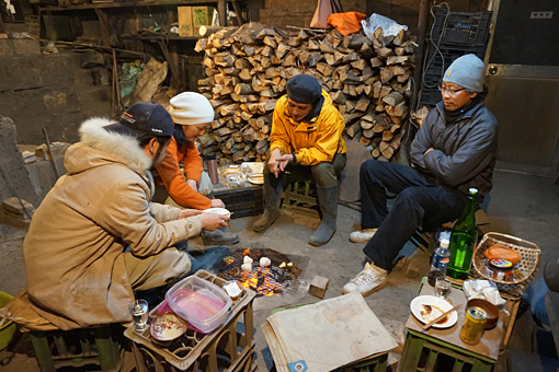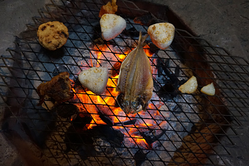 僕らは時々、長老たちと一緒に炭焼き小屋で、炭火を囲んで地元の山海の幸を炙りながら、楽しい食事会を開きます。