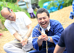 はじめての方にとって稲わらを撚ることは、最初は中々出来ないのですが、コツをつかむと面白いように出来るようになります。そして、両手からスルスルとすがい縄が生まれてくると、つい嬉しくなっちゃいます。