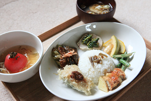メインプレートには、去年の鴨川棚田トラストでつくった天水棚田の無農薬天日干し長狭米のごはん、鴨川産ワラサの味噌漬けと翡翠茄子(ひすいなす)、ピーマンの玄米詰め天ぷら 自家製味噌ダレかけ、鴨川産鯵のメンチカツと蒸し新ジャガイモ、自家製鶏ハムとひゅう菜のマスタード和え、インゲンのピーナッツ和え、小メロンとズッキーニのピクルス、自家製らっきょう、野蕗のきゃらぶき。