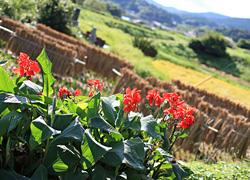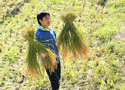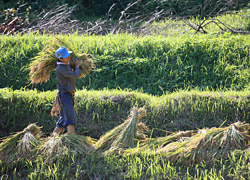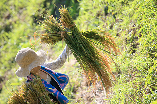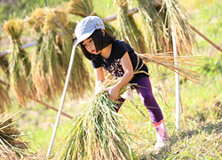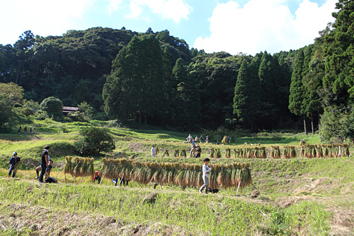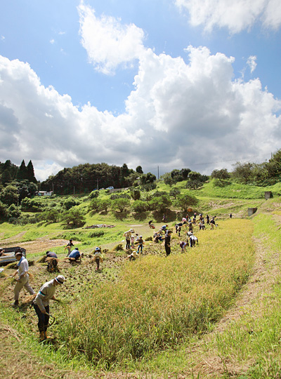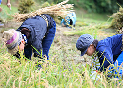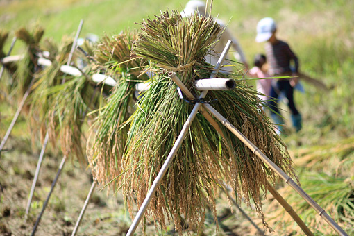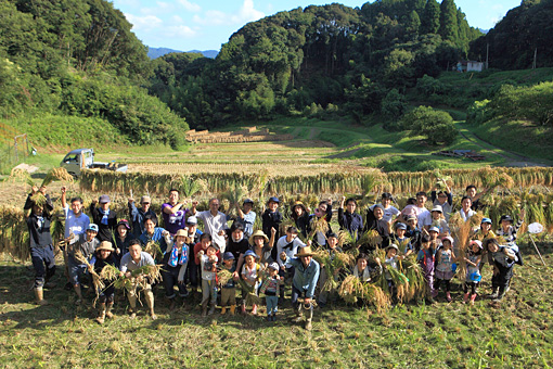 冬の間に去年の台風で崩れてしまった棚田を直し、雨の少ない春に苦労して天水棚田に水を溜め、その間に苗を育て、苗が大きく育った5月に多くのみなさんと田植えを行いました。その後、夏の暑い盛りに法面の草刈りや水の管理、田の草とりを2回行い、我が子のように大切に育てた稲は、やがて可憐な白い花を咲かせ、稲穂がふくらんだ実りの秋にやっと稲刈りを迎えます。