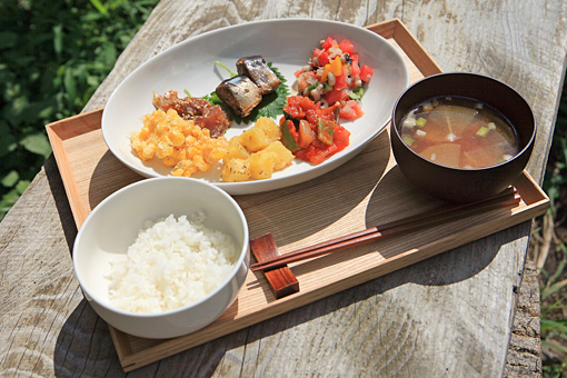 ランチのメニューは、イナダのコリアン風ヅケ、骨まで柔らかサンマの梅干煮、ラタトゥイユ、豆と野菜のブラジル風サラダ、ジャガイモ炒めアンチョビ風味、トウモロコシのかき揚げ、イナダのアラ汁、さとみさんが棚田で育てたお米のごはんと食材のほとんどは地元産にこだわり、さらに調味料の味噌、醤油、豆板醤、アンチョビまでもさとみさんの自家製です。