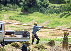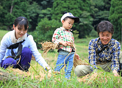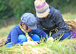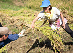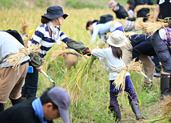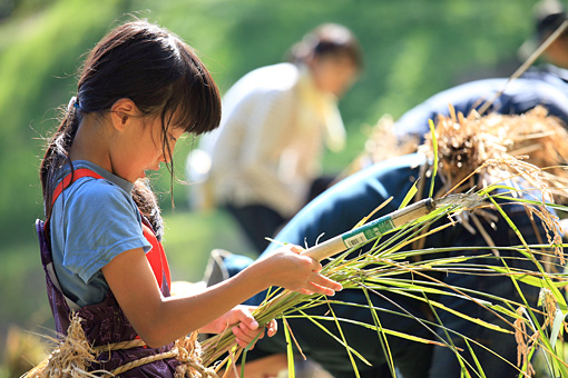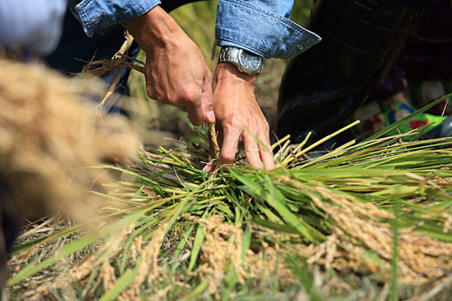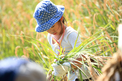 ずっしりと実った稲わらを、刈り取っていく作業は、お米づくりのクライマックスです。